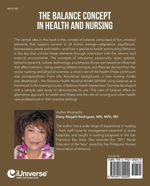 The central idea in this book is the concept of balance composed of five universal elements that support survival of all human beings-adaptation, equilibrium, homeostasis, needs and health and how it applies to health and nursing. Behavior is the key that unlocks these elements through interaction with the internal and external environments. The concepts of imbalance, personality, open systems, behavior pyramid, culture, technology, and physical forces are viewed as influences that affect behavior. Using existing related concepts and theories derived from the social, nursing, and physical sciences, a novel view of the health-illness continuum was conceptualized. From this theoretical background, a new nursing model was developed - the Balance-Health Nursing Model (BHNM) using balance as a framework in the nursing process. A Balance Health Assessment Tool was developed with a sample case study to demonstrate its use. This view of balance offers an alternative approach to health and illness and the role of nursing and other health care professionals in their practice settings.
