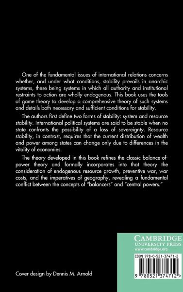 One of the fundamental issues of international relations concerns whether, and under what conditions, stability prevails in anarchic systems, these being systems in which all authority and institutional restraints to action are wholly endogenous. This book uses the tools of game theory to develop a comprehensive theory of such systems and details both necessary and sufficient conditions for stability. The authors first define two forms of stability: system and resource stability. International political systems are said to be stable when no state confronts the possibility of a loss of sovereignty. Resource stability, in contrast, requires that the current distribution of wealth and power among states can change only due to differences in the vitality of economies. The theory developed in this book refines the classic balance-of-power theory and formally incorporates into that theory the consideration of endogenous resource growth, preventive war, war costs and the imperatives of geography, revealing a fundamental conflict between the concepts of 'balancers' and 'central powers'.
