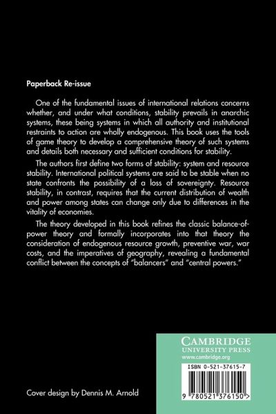 One of the fundamental issues of international relations concerns whether, and under what conditions, stability prevails in anarchic systems, these being systems in which all authority and institutional restraints to action are wholly endogenous. This book uses the tools of game theory to develop a comprehensive theory of such systems and details both necessary and sufficient conditions for stability. The authors first define two forms of stability: system and resource stability. International political systems are said to be stable when no state confronts the possibility of a loss of sovereignty. Resource stability, in contrast, requires that the current distribution of wealth and power among states can change only due to differences in the vitality of economies. The theory developed in this book refines the classic balance-of-power theory and formally incorporates into that theory the consideration of endogenous resource growth, preventive war, war costs and the imperatives of geography, revealing a fundamental conflict between the concepts of 'balancers' and 'central powers'.
