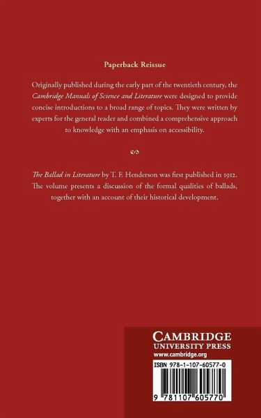Originally published during the early part of the twentieth century, the Cambridge Manuals of Science and Literature were designed to provide concise introductions to a broad range of topics. They were written by experts for the general reader and combined a comprehensive approach to knowledge with an emphasis on accessibility. The Ballad in Literature by T. F. Henderson was first published in 1912. The volume presents a discussion of the formal qualities of ballads, together with an account of their historical development.