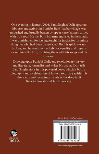 On the evening of 5th January 2006, Bant Singh, a Dalit agrarian labourer and activist in Punjab's Jhabar village, was ambushed and brutally beaten by upper-caste Jat men armed with iron rods and axes. He lost both his arms and a leg in the attack. It was punishment for having fought for justice for his minor daughter who had been gang-raped. But his spirit was not broken, and he continues to fight for equality and dignity for millions like him, inspiring them with his revolutionary songs and his courage. Journalist and writer Nirupama Dutt tells Bant Singh's story in this powerful book which is both the biography of an extraordinary human being and a comment on the deep fault lines in Punjabi and Indian society.