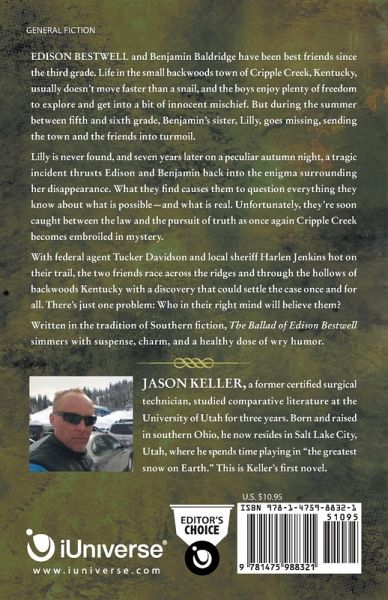 Edison Bestwell and Benjamin Baldridge have been best friends since the third grade. Life in the small backwoods town of Cripple Creek, Kentucky, usually doesn't move faster than a snail, and the boys enjoy plenty of freedom to explore and get into a bit of innocent mischief. But during the summer between fifth and sixth grade, Benjamin's sister, Lilly, goes missing, sending the town and the friends into turmoil. Lilly is never found, and seven years later on a peculiar autumn night, a tragic incident thrusts Edison and Benjamin back into the enigma surrounding her disappearance. What they find causes them to question everything they know about what is possible-and what is real. Unfortunately, they're soon caught between the law and the pursuit of truth as once again Cripple Creek becomes embroiled in mystery. With federal agent Tucker Davidson and local sheriff Harlen Jenkins hot on their trail, the two friends race across the ridges and through the hollows of backwoods Kentucky with a discovery that could settle the case once and for all. There's just one problem: Who in their right mind will believe them? Written in the tradition of Southern fiction, The Ballad of Edison Bestwell simmers with suspense, charm, and a healthy dose of wry humor.
