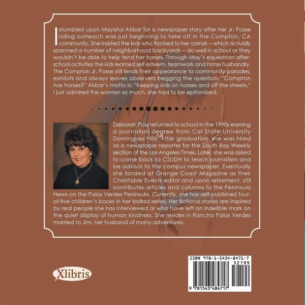 I stumbled upon Mayisha Akbar for a newspaper story after her Jr. Posse riding outreach was just beginning to take off in the Compton, CA community. She insisted the kids who flocked to her corrals -- which actually spanned a number of neighborhood backyards -- do well in school or they wouldnt be able to help tend her horses. Through Mays equestrian after-school activities the kids learned self esteem, teamwork and horse husbandry. The Compton Jr. Posse still lends their appearance to community parades, exhibits and always leaves observers begging the question: Compton has horses? Akbars motto is: Keeping kids on horses and off the streets. I just admired this woman so much, she had to be epitomized.