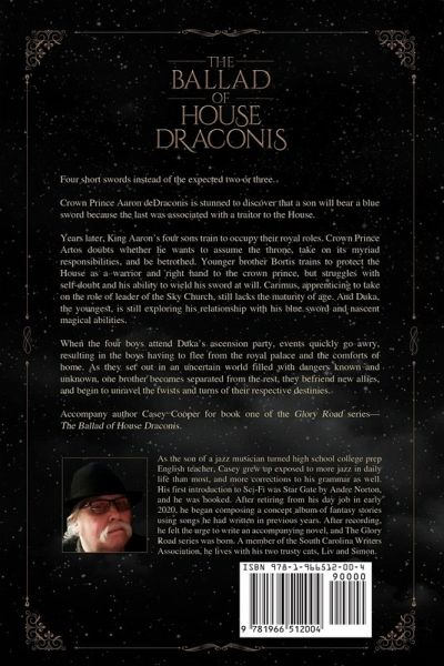 Four short swords instead of the expected two or three. Crown Prince Aaron deDraconis is stunned to discover that a son will bear a blue sword because the last was associated with a traitor to the House. Years later, King Aaron's four sons train to occupy their royal roles. Crown Prince Artos doubts whether he wants to assume the throne, take on its myriad responsibilities, and be betrothed. Younger brother Bortis trains to protect the House as a warrior and right hand to the crown prince, but struggles with self-doubt and his ability to wield his sword at will. Carimus, apprenticing to take on the role of leader of the Sky Church, still lacks the maturity of age. And Duka, the youngest, is still exploring his relationship with his blue sword and nascent magical abilities. When the four boys attend Duka's ascension party, events quickly go awry, resulting in the boys having to flee from the royal palace and the comforts of home. As they set out in an uncertain world filled with dangers known and unknown, one brother becomes separated from the rest, they befriend new allies, and begin to unravel the twists and turns of their respective destinies. Accompany author Casey Cooper for book one of the Glory Road series-the Ballad of House Draconis.