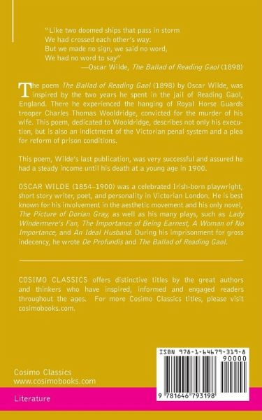 "Like two doomed ships that pass in storm We had crossed each other's way: But we made no sign, we said no word, We had no word to say" -Oscar Wilde, The Ballad of Reading Gaol (1898) The poem The Ballad of Reading Gaol (1898) by Oscar Wilde, was inspired by the two years he spent in the jail of Reading Gaol, England. There he experienced the hanging of Royal Horse Guards trooper Charles Thomas Wooldridge, convicted for the murder of his wife. This poem, dedicated to Wooldridge, describes not only his execution, but is also an indictment of the Victorian penal system and a plea for reform of prison conditions. This poem, Wilde's last publication, was very successful and assured he had a steady income until his death at a young age in 1900.
