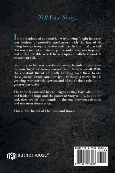 "Tell Your Story." In the shadows of our world, a war is being fought between two factions of powerful spellcasters with the fate of all living beings hanging in the balance. In the final days of this war, a man of sinister elegance and grace rises to power, and with a terrible secret, he sets upon a path to reawaken an ancient evil. Standing in his way are three young friends, prophesied to come together in our darkest hour to save us all. With the constant threat of death hanging over their heads, these young friends must navigate through a world that is growing ever more dangerous and discover their role in the greater narrative. The three friends will be challenged as they learn about love and faith and hope and the power of Storytelling, but in the end, they are all that stands in the way between salvation and our utter destruction. This is The Ballad of The Ring and Roses.