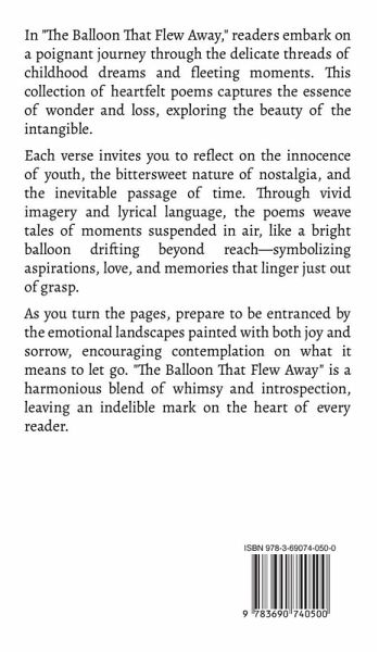 In "The Balloon That Flew Away," readers embark on a poignant journey through the delicate threads of childhood dreams and fleeting moments. This collection of heartfelt poems captures the essence of wonder and loss, exploring the beauty of the intangible. Each verse invites you to reflect on the innocence of youth, the bittersweet nature of nostalgia, and the inevitable passage of time. Through vivid imagery and lyrical language, the poems weave tales of moments suspended in air, like a bright balloon drifting beyond reach-symbolizing aspirations, love, and memories that linger just out of grasp. As you turn the pages, prepare to be entranced by the emotional landscapes painted with both joy and sorrow, encouraging contemplation on what it means to let go. "The Balloon That Flew Away" is a harmonious blend of whimsy and introspection, leaving an indelible mark on the heart of every reader.