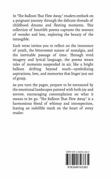 In "The Balloon That Flew Away," readers embark on a poignant journey through the delicate threads of childhood dreams and fleeting moments. This collection of heartfelt poems captures the essence of wonder and loss, exploring the beauty of the intangible. Each verse invites you to reflect on the innocence of youth, the bittersweet nature of nostalgia, and the inevitable passage of time. Through vivid imagery and lyrical language, the poems weave tales of moments suspended in air, like a bright balloon drifting beyond reach-symbolizing aspirations, love, and memories that linger just out of grasp. As you turn the pages, prepare to be entranced by the emotional landscapes painted with both joy and sorrow, encouraging contemplation on what it means to let go. "The Balloon That Flew Away" is a harmonious blend of whimsy and introspection, leaving an indelible mark on the heart of every reader.