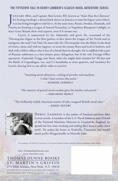 January 1801, and Captain Alan Lewrie, Royal Navy, known as ""St. Alan the Liberator"" for freeing (stealing!) a dozen black slaves on Jamaica to man his frigate years before, is at last being brought to trial for it, with his life on the line. At the same time, Russia, Sweden, Denmark, and Prussia are forming a League of Armed Neutrality, to Napoleon Bonaparte's delight, to deny Great Britain their vital exports, even if it means war. England will need all her experienced sea dogs, but ... even Alan Lewrie? Ultimately Lewrie is acquitted, but he's also ignored by the Navy, so it's half-pay on ""civvy street"" for him, and with idle time on his mischievous hands, Lewrie is sure to get himself in trouble---again!---especially if there are young women and his wastrel public school friends involved...and they are! A brawl in a Panton Saint brothel, a drunk, infatuated young Russian count, precede Lewrie's summons to Admiralty and the command of the Thermopylae frigate to replace an ill captain as the fleet gathers to face down the League of the North, and its instigator, the mad Tsar Paul. Lewrie must take the Thermopylae into the Baltic in the dead of winter, alone and with no support, to scout the enemy fleets and iced-in harbors, deal with a fellow officer who is less of a friend than he thought, and be saddled with a pair of Russian noblemen as a last-minute peace delegation, but if the wily Foreign Office spy-master, Zachariah Twigg, sent them, what else might their mission be? All that and the Battle of Copenhagen, too, and it's broadsides at close quarters, and treachery for Lewrie, forcing him to use all his wiles to survive! The Baltic Gambit is one of Dewey Lambdin's most enjoyable naval adventures yet.