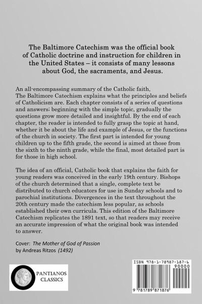 The Baltimore Catechism was the official book of Catholic doctrine and instruction for children in the United States – it consists of many lessons about God, the sacraments, and Jesus. An all-encompassing summary of the Catholic faith, The Baltimore Catechism explains what the principles and beliefs of Catholicism are. Each chapter consists of a series of questions and answers; beginning with the simple topic, gradually the questions grow more detailed and insightful. By the end of each chapter, the reader is intended to fully grasp the topic at hand, whether it be about the life and example of Jesus, or the functions of the church in society. The first part is intended for young children up to the fifth grade, the second is aimed at those from the sixth to the ninth grade, while the final, most detailed part is for those in high school. The idea of an official, Catholic book that explains the faith for young readers was conceived in the early 19th century. Bishops of the church determined that a single, complete text be distributed to church educators for use in Sunday schools and to parochial institutions. Divergences in the text throughout the 20th century made the catechism less popular, as schools established their own curricula. This edition of The Baltimore Catechism replicates the 1891 text, so that readers may receive an accurate impression of what the original book was intended to answer.