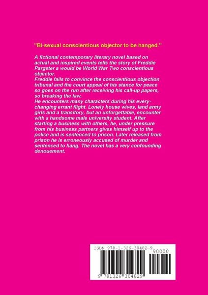 "Bi-sexual conscientious objector to be hanged." A fictional contemporary literary novel based on actual and inspired events tells the story of Freddie Pargeter a would be World War Two conscientious objector. Freddie fails to convince the conscientious objection tribunal and the court appeal of his stance for peace so goes on the run, after receiving his call-up parers, so breaking the law. He encounters many characters during his every-changing errant flight. Lonely house wives, land army girls and a transitory, but an unforgettable, encounter with a handsome male university student. After starting a business with others, he, under pressure from his business partners gives himself up to the police and is sentenced to prison. Later released from prison he is erroneously accused of murder and sentenced, by a very prejudiced jury, to hang.