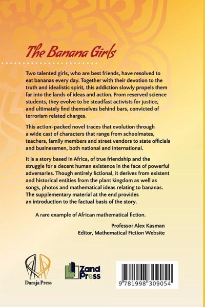 Two talented girls, who are best friends, have resolved to eat bananas every day. Together with their devotion to the truth and idealistic spirit, this addiction slowly propels them far into the lands of ideas and action. From reserved science students, they evolve to be steadfast activists for justice, and ultimately fi¬nd themselves behind bars, convicted of terrorism related charges. This action packed novel traces that evolution through a wide cast of characters that range from schoolmates, teachers, family members, street vendors to state officials and businessmen, both national and international It is a story based in Africa, of true friendship and the struggle for a decent human existence in the face of powerful adversaries. Though entirely fictional, it derives from existent and historical realities. Interspersed within its pages, you will find enticing entities from the plant kingdom as well as songs, photos and mathematical ideas relating to bananas. The supplementary material at the end provides an introduction to the factual basis of the story.