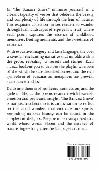 In "The Banana Grove," immerse yourself in a vibrant tapestry of verses that celebrate the beauty and complexity of life through the lens of nature. This exquisite collection invites readers to wander through lush landscapes of ripe yellow fruit, where each poem captures the essence of childhood memories, fleeting moments, and the sweetness of existence. With evocative imagery and lush language, the poet weaves an enchanting narrative that unfolds within the grove, revealing its secrets and stories. Each stanza beckons you to explore the playful whispers of the wind, the sun-drenched leaves, and the rich symbolism of bananas as metaphors for growth, sustenance, and joy. Delve into themes of resilience, connection, and the cycle of life, as the poems resonate with heartfelt emotion and profound insight. "The Banana Grove" is not just a collection; it is an invitation to reflect on the small wonders that cultivate our spirits, reminding us that beauty can be found in the simplest of delights. Prepare to be transported to a world where words bloom and the essence of nature lingers long after the last page is turned.