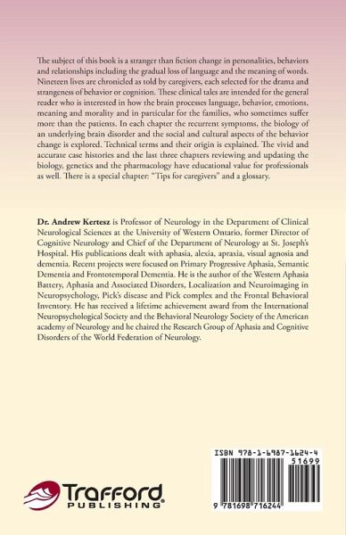 The subject of this book is a stranger than fiction change in personalities, behaviors and relationships including the gradual loss of language and the meaning of words. Nineteen lives are chronicled as told by caregivers, each selected for the drama and strangeness of behavior or cognition. These clinical tales are intended for the general reader who is interested in how the brain processes language, behavior, emotions, meaning and morality and in particular for the families, who sometimes suffer more than the patients. In each chapter the recurrent symptoms, the biology of an underlying brain disorder and the social and cultural aspects of the behavior change is explored. Technical terms and their origin is explained. The vivid and accurate case histories and the last three chapters reviewing and updating the biology, genetics and the pharmacology have educational value for professionals as well. There is a special chapter: "Tips for caregivers" and a glossary.