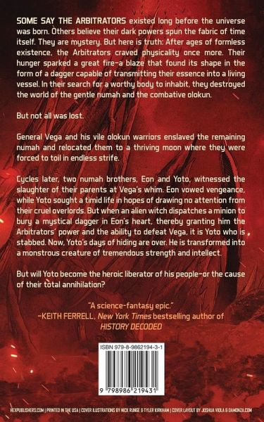 Some say the Arbitrators existed long before the universe was born. Others believe their dark powers spun the fabric of time itself. They are mystery. But here is truth: After ages of formless existence, the Arbitrators craved physicality once more. Their hunger sparked a great fire-a blaze that found its shape in the form of a dagger capable of transmitting their essence into a living vessel. In their search for a worthy body to inhabit, they destroyed the world of the gentle numah and the combative olokun. But not all was lost. General Vega and his vile olokun warriors enslaved the remaining numah and relocated them to a thriving moon where they were forced to toil in endless strife. Cycles later, two numah brothers, Eon and Yoto, witnessed the slaughter of their parents at Vega's whim. Eon vowed vengeance, while Yoto sought a timid life in hopes of drawing no attention from their cruel overlords. But when an alien witch dispatches a minion to bury a mystical dagger in Eon's heart, thereby granting him the Arbitrators' power and the ability to defeat Vega, it is Yoto who is stabbed. Now, Yoto's days of cowardice are over. He is transformed into a monstrous creature of tremendous strength and intellect. But will Yoto become the heroic liberator of his people-or the cause of their total annihilation?
