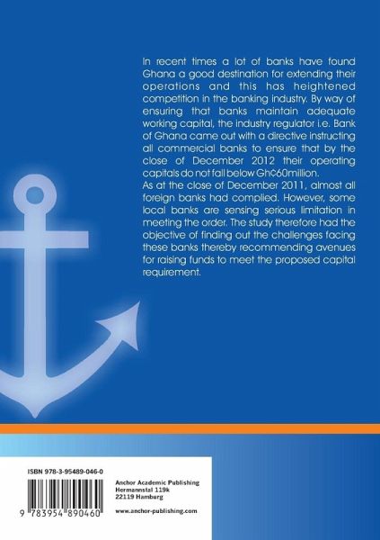 For in recent times, a lot of banks have rated Ghana a good destination to extend their operations, the competition in the banking industry has heightened. To ensure that banks maintain adequate working capital, the industry regulator, i.e. the Bank of Ghana, issued a directive instructing all commercial banks to ensure that by the close of December 2012 their operating capitals do not fall below GH Ct. 60million. At the close of December 2011, almost all foreign banks had complied. However, some of the local banks are sensing serious limitation in meeting the order. Therefore, the study has the objective to identify the challenges these banks have to face and thereby, the author will recommend avenues for raising funds to meet the proposed capital requirement.