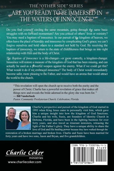 Are You Ready to be Immersed in the Waters of Innocence? Do you find yourself circling the same mountain, going through the same basic struggles with no forward momentum? Are you critical of others’ lives or ministry? You may need a baptism of innocence. In our pursuit of the kingdom of heaven, we often leave the place of humility and innocence by complicating God’s grace; we can’t forgive ourselves and hold others to a standard not held by God. By receiving the baptism of innocence, we return to the state of childlikeness that brings us into right relationship with Him and the body of Christ. The Baptism of Innocence is a life-changer—or more correctly, a kingdom-changer. Innocence will restore a measure of the kingdom of God that has been missing, and can actually be used as a powerful weapon against the enemy. What if we could get this? What would it do if we embraced innocence? The body of Christ would immediately become safer, more pleasing to the Father, and would have an aroma that would attract the world to the church. This revelation will open the church up to receive both the purity and the power of Christ. Charlie has a powerful revelation of grace that makes all things new and reveals the bride adorned in the glory she was born for. — Bill Vanderbush Author and Pastor of Community Presbyterian Church, Celebration, Florida The Baptism of Innocence is a revelation from God that will advance His kingdom far beyond anything we can imagine. Put your seatbelt on, because you’re in for the ride of your life! — Matthew Sassano, Jr. Lead Pastor, Fresh Start Church, Hornell, New York