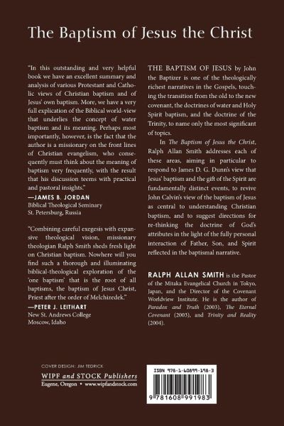 The baptism of Jesus by John the Baptizer is one of the theologically richest narratives in the Gospels, touching the transition from the old to the new covenant, the doctrines of water and Holy Spirit baptism, and the doctrine of the Trinity, to name only the most significant of topics. In The Baptism of Jesus the Christ, Ralph Allan Smith addresses each of these areas, aiming in particular to respond to James D. G. Dunn's view that Jesus' baptism and the gift of the Spirit are fundamentally distinct events, to revive John Calvin's view of the baptism of Jesus as central to understanding Christian baptism, and to suggest directions for re-thinking the doctrine of God's attributes in the light of the fully personal interaction of Father, Son, and Spirit reflected in the baptismal narrative.