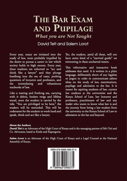 Every year, many are initiated into the study of law, most probably impelled by the desire to pursue a career in law which society holds in high esteem. Every year, these students are exhorted to "act and think like a lawyer" and they plunge headlong into the sea of cases, probing questions of lecturers and professors, and the intimidating and voluminous textbooks of law. Like a roaring and frothing sea, carrying with it debris, broken twigs and lifeless wood, soon the student is carried by the tide. "You are privileged to be here," the student will be reminded. This will be codename for the student to work hard and speak, think and act like a lawyer. Yet, the student, amid all these, will not have some kind of a "survival guide" on swimming in these uncharted waters. This informative and interactive book addresses that need. It is written in a plain language, deliberately shorn of any legalese or jargon in order to communicate salient ideas on the study of law, examinations, pupilage and admission to the bar. It is meant for aspiring students of law, current law students at the universities and the Kenya School of Law, law lecturers and professors, practitioners of law and any reader who wants to know what law is and the journey from being a law student from the university to the Kenya School of Law to admission to the bar and beyond.