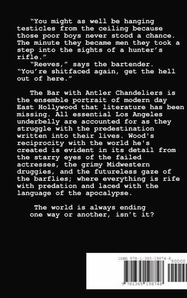 "You might as well be hanging testicles from the ceiling because those poor boys never stood a chance. The minute they became men they took a step into the sights of a hunter's rifle." "Reeves," says the bartender. "You're shitfaced again, get the hell out of here." The Bar with Antler Chandeliers is the ensemble portrait of modern day East Hollywood that literature has been missing. All essential Los Angeles underbelly are accounted for as they struggle with the predestination written into their lives. Wood's reciprocity with the world he's created is evident in its detail from the starry eyes of the failed actresses, the grimy Midwestern druggies, and the futureless gaze of the barflies; where everything is rife with predation and laced with the language of the apocalypse. The world is always ending one way or another, isn't it?