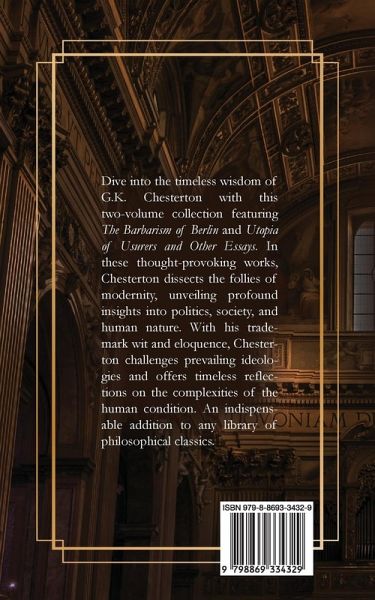 Dive into the timeless wisdom of G.K. Chesterton with this two-volume collection featuring The Barbarism of Berlin and Utopia of Usurers and Other Essays. In these thought-provoking works, Chesterton dissects the follies of modernity, unveiling profound insights into politics, society, and human nature. With his trademark wit and eloquence, Chesterton challenges prevailing ideologies and offers timeless reflections on the complexities of the human condition. An indispensable addition to any library of philosophical classics.