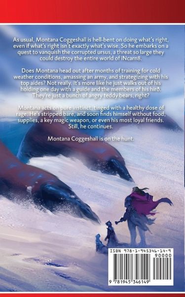 As usual, Montana Coggeshall is hell-bent on doing what's right, even if what's right isn't exactly what's wise. So he embarks on a quest to vanquish the corrupted ursus, a threat so large they could destroy the entire world of iNcarn8. Does Montana head out after months of training for cold weather conditions, amassing an army, and strategizing with his top aides? Not really. It's more like he just walks out of his holding one day with a guide and the members of his hirð. They're just a bunch of angry teddy bears, right? Montana acts on pure instinct, tinged with a healthy dose of rage. He's stripped bare, and soon finds himself without food, supplies, a key magic weapon, or even his most loyal friends. Still, he continues. Montana Coggeshall is on the hunt.