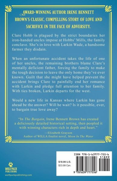 Award-winning author Irene Bennett Brown's classic, compelling story of love and sacrifice in the face of adversity. Clare Hobb is plagued by the strict boundaries her iron-handed uncles impose at Hobbs' Mills, the family conclave. She's in love with Larkin Wade, a handsome farmer they disdain. When an unfortunate accident takes the life of one of her uncles, the remaining brothers blame Clare's mentally deficient father, forcing the family to make the tough decision to leave the only home they've ever known. Guilt that she might have helped prevent the accident brings Clare to painfully end her romance with Larkin and pledge full attention to her family. With ties broken, Larkin departs for the west. Would a new life in Kansas where Larkin has gone ahead be the answer? Will he wait? Is it possible, ever, to bargain true love away? "Irene Bennett Brown has put heart, soul, and historical detail in her story of love and sacrifice in 19th century New Hampshire and Kansas. Read The Bargain." Lucia St. Clair Robson, bestselling author of The Shadow Patriot "The Bargain is a powerful novel about moral and spiritual courage, and offers radiant insight into how lives are won or lost by the choices we all make. This is a beautiful and compelling novel." Richard Wheeler, award winning author of The Canyon Of Bones "Irene Bennett Brown offers a stirring and complex story of love and family with an unforgettable protagonist in a novel that is just wonderful." Michelle Black, author of the bestselling novel An Uncommon Enemy "In The Bargain, Irene Bennett Brown has created a deliciously detailed historical setting, then peopled it with winning characters rich in depth and heart." Elizabeth Grayson, author of WILLA finalist novel, Moon In The Water