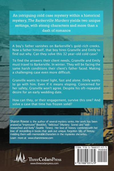 A cold case mystery within a historical mystery, The Barkerville Murders yields two unique settings, with strong characters and more than a dash of romance. In 1868, a boy's father vanishes on Barkerville's gold-rich creeks. Thirty-two years later that boy, now a father himself, hires Granville and Emily to find out why. Can they solve this very cold case? To find the answers their client needs, Granville and Emily must travel to Barkerville. In winter. They'll be facing the same harsh weather their client's father faced. Making a challenging case even more difficult. Granville wants to travel light, fast and alone. Emily wants to go with him. Even if it means eloping. Concerned for her safety, Granville won't agree. Despite his oft-repeated desire for an early wedding date. How will they-or their engagement-survive this one? And solve a case time has frozen solid. This is the eighth book in the historical mystery series featuring John Granville and Emily Turner, and can be read as a stand alone.