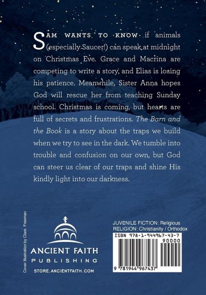 Sam wants to know if animals (especially Saucer!) can speak at midnight on Christmas Eve. Grace and Macrina are competing to write a story, and Elias is losing his patience. Meanwhile, Sister Anna hopes God will rescue her from teaching Sunday school. Christmas is coming, but hearts are full of secrets and frustrations. The Barn and the Book is a story about the traps we build when we try to see in the dark. We tumble into trouble and confusion on our own, but God can steer us clear of our traps and shine His kindly light into our darkness. A chapter book for ages 7 to 12 This is the second book in the "Sam and Saucer" series. ¿An Orthodox Christian children's book from Ancient Faith Publishing.