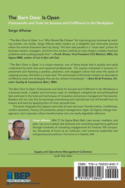 The Barn Door Is Open: Frameworks and Tools for Success and Fulfillment in the Workplace is a business book, a playful and humorous read, an intelligent metaphorical and philosophical tale anchored in the tools and techniques of innovative and proven management frameworks. Readers will not only find its teachings entertaining and inspirational, but will benefit from its lessons and tools by applying them to their personal lives. This book integrates the subjects and tools of Lean and Lean Transformation, mindfulness, conflict resolution, Theory of Constraints, project management, Agile, Six Sigma, change management, and corporate culture transformation into one easily digestible reference.