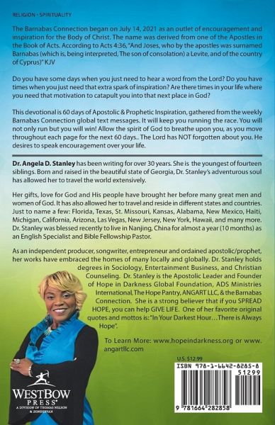 The Barnabas Connection began on July 14, 2021 as an outlet of encouragement and inspiration for the Body of Christ. The name was derived from one of the Apostles in the Book of Acts. According to Acts 4:36, "And Joses, who by the apostles was surnamed Barnabas (which is, being interpreted, The son of consolation) a Levite, and of the country of Cyprus)" KJV Do you have some days when you just need to hear a word from the Lord? Do you have times when you just need that extra spark of inspiration? Are there times in your life where you need that motivation to catapult you into that next place in God? This devotional is 60 days of Apostolic & Prophetic Inspiration, gathered from the weekly Barnabas Connection global text messages. It will keep you running the race. You will not only run but you will win! Allow the spirit of God to breathe upon you, as you move throughout each page for the next 60 days.. The Lord has NOT forgotten about you. He desires to speak encouragement over your life.