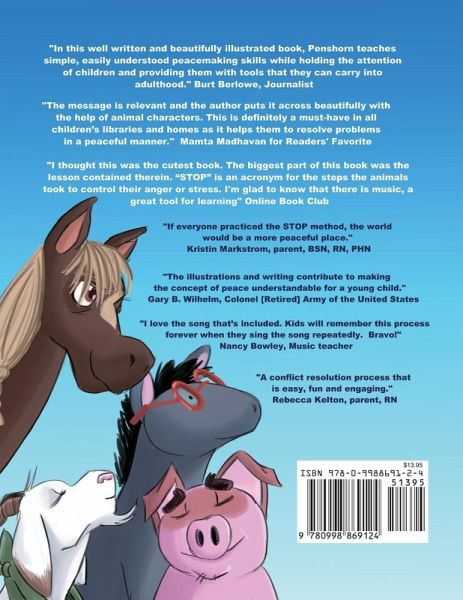 The delightful Barnyard Buddies engage everyone as they show how to use peaceful conflict resolution and dialogue for problem-solving! This rhyming, richly illustrated children's book, for ages 3 to 8, conveys important social skills and anger management tools. With a wonderful Parent and Educator Guide, and a complete Mentor Program Guide included, this is a comprehensive smart tool! Plus, kids love it! The Barnyard Buddies are angry because King is taking all the space under the shelter. After they stop and breathe, and get guidance from a wise owl, they can hear how King is hurt and lonely and solve the problem. Children develop skills for anger management, empathy, and compassion. Keys to success in life. Children relate to the loveable characters, whose emotions are charmingly revealed by artist Jorry Keith. The heartfelt way Julie Penshorn presents this topic, the sensitive illustrations, and the music that supports the learning, make this book a children's favorite! The cornerstone for the entire "STOP for Peace" process is S, STOP and breathe. Peace is only possible when all have cooled off and embraced the insights provided by anger management, then they can dialogue about their other emotions in step T, Tell how you feel. O, Open your mind (brainstorm) and P, Plan a deal are the remaining steps. When people can safely speak from their hearts, they find solutions that work for all. That's the sign of successful conflict resolution! Music notation for the "STOP for Peace" song is included, to reinforce the learning. "I STOP for Peace" companion CD, also by Julie Penshorn, is available through the publisher and other outlets (look for it on the site you are on right now!) where music is sold. The music builds the skills and carries them deep into the brain so they are never forgotten. Add an extra book to your cart to give to a teacher, a neighbor, faith-community, or a friend! Help your child experience a safer, friendlier, classroom environment. Share "The Barnyard Buddies STOP for Peace"! Your review can make a difference, as the more children exposed to these skills, the better the environment for your child/ren, and the more peaceful our shared future. Brought to you by the peace education specialists at the non-profit organization, Growing Communities for Peace, through its project, Smart Tools for Life.
