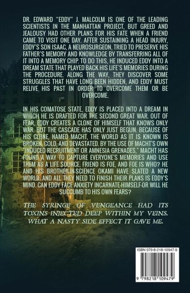 Dr. Edward "Eddy" J. Malcolm is one of the leading scientists in the Manhattan Project, but greed and jealousy had other plans for his fate when a friend came to visit one day. After sustaining a head injury, Eddy's son Isaac, a neurosurgeon, tried to preserve his father's memory and knowledge by transferring all of it into a memory chip. To do this, he induced Eddy into a dream state that played back his life's memories during the procedure. Along the way, they discover some struggles that have long been hidden, and Eddy must relive his past in order to overcome them or be overcome. In his comatose state, Eddy is placed into a dream in which he is drafted for the second Great War. Out of fear, Eddy creates a clone of himself that knows only war. But the cascade has only just begun. Because of his clone, named Macht, the world as it is known is broken, cold, and devastated. By the use of Macht's own "Induced Recruitment or Amnesia Grenades," Macht has found a way to capture everyone's memories and use them as a life source. Friend is foe, and foe is who? He and his brother-in-science Okami have slated a new world, and all they need to finish their plans is Eddy's mind. Can Eddy face anxiety incarnate-himself-or will he succumb to his own fears?