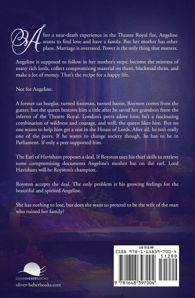 England, 1887 After a near-death experience in the Theatre Royal fire, Angeline wants to find love and have a family. But her mother has other plans. Marriage is overrated. Power is the only thing that matters. Angeline is supposed to follow in her mother's steps: become the mistress of many rich lords, collect compromising material on them, blackmail them, and make a lot of money. That's the recipe for a happy life. Not for Angeline. A former cat burglar, turned footman, turned baron, Royston comes from the gutter, but the queen bestows him a title after he saved her grandson from the inferno of the Theatre Royal. London's peers adore him; he's a fascinating combination of wildness and courage, and well, the queen likes him. But no one wants to help him get a seat in the House of Lords. After all, he isn't really one of the peers. If he wants to change society though, he has to be in Parliament. If only a peer supported him. The Earl of Havisham proposes a deal. If Royston uses his thief skills to retrieve some compromising documents Angeline's mother has on the earl, Lord Havisham will be Royston's champion. Royston accepts the deal. The only problem is his growing feelings for the beautiful and spirited Angeline. She has nothing to lose, but does she want to pretend to be the wife of the man who ruined her family?