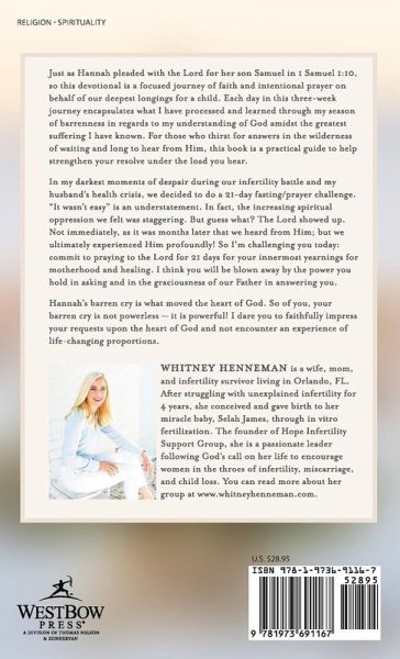 Just as Hannah pleaded with the Lord for her son Samuel in 1 Samuel 1:10, so this devotional is a focused journey of faith and intentional prayer on behalf of our deepest longings for a child. Each day in this three-week journey encapsulates what I have processed and learned through my season of barrenness in regards to my understanding of God amidst the greatest suffering I have known. For those who thirst for answers in the wilderness of waiting and long to hear from Him, this book is a practical guide to help strengthen your resolve under the load you bear. In my darkest moments of despair during our infertility battle and my husbands' health crisis, we decided to do a 21-day fasting/prayer challenge. "It wasn't easy" is an understatement. In fact, the increasing spiritual oppression we felt was staggering. But guess what? The Lord showed up. Not immediately, as it was months later we heard from Him; but we ultimately experienced Him profoundly! So I'm challenging you today: commit to praying to the Lord for 21 days for your innermost yearnings for motherhood and healing. I think you will be blown away by the power you hold in asking and in the graciousness of our Father in answering you. Hannah's barren cry is what moved the heart of God. So of you, your barren cry is not powerless-it is powerful! I dare you to faithfully impress your requests upon the heart of God and not encounter an experience of life changing proportions.