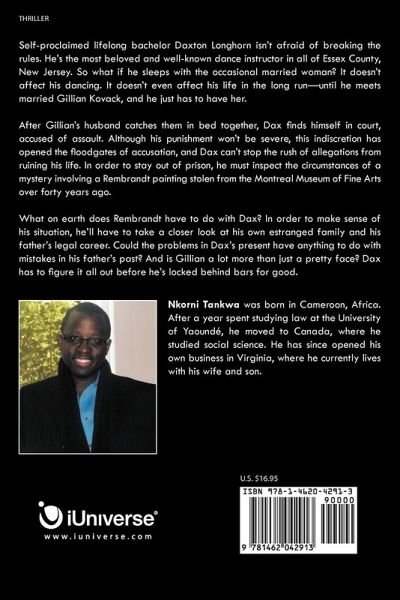 Self-proclaimed lifelong bachelor Daxton Longhorn isn't afraid of breaking the rules. He's the most beloved and well-known dance instructor in all of Essex County, New Jersey. So what if he sleeps with the occasional married woman? It doesn't affect his dancing. It doesn't even affect his life in the long run-until he meets married Gillian Kovack, and he just has to have her. After Gillian's husband catches them in bed together, Dax finds himself in court, accused of assault. Although his punishment won't be severe, this indiscretion has opened the floodgates of accusation, and Dax can't stop the rush of allegations from ruining his life. In order to stay out of prison, he must inspect the circumstances of a mystery involving a Rembrandt painting stolen from the Montreal Museum of Fine Arts over forty years ago. What on earth does Rembrandt have to do with Dax? In order to make sense of his situation, he'll have to take a closer look at his own estranged family and his father's legal career. Could the problems in Dax's present have anything to do with mistakes in his father's past? And is Gillian a lot more than just a pretty face? Dax has to figure it all out before he's locked behind bars ... for good.