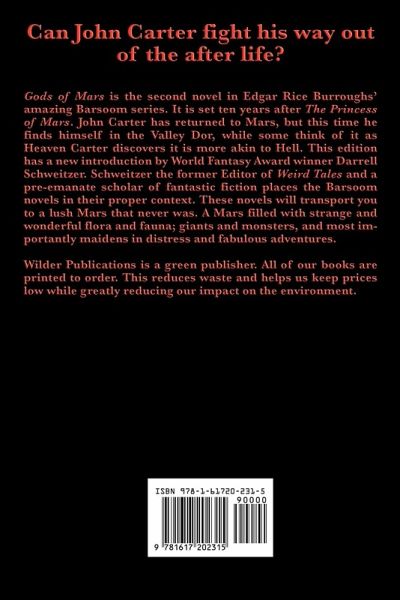 Gods of Mars is the second novel in Edgar Rice Burroughs' amazing Barsoom series. It is set ten years after The Princess of Mars. John Carter has returned to Mars, but this time he finds himself in the Valley Dor, while some think of it as Heaven Carter discovers it is more akin to Hell. This edition has a new introduction by World Fantasy Award winner Darrell Schweitzer. Schweitzer the former Editor of Weird Tales and a pre-emanate scholar of fantastic fiction places the Barsoom novels in their proper context. These novels will transport you to a lush Mars that never was. A Mars filled with strange and wonderful flora and fauna; giants and monsters, and most importantly maidens in distress and fabulous adventures. Wilder Publications is a green publisher. All of our books are printed to order. This reduces waste and helps us keep prices low while greatly reducing our impact on the environment.