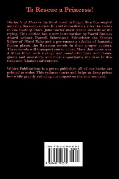 Warlords of Mars is the third novel in Edgar Rice Burroughs' amazing Barsoom series. It is set immediately after the events in The Gods of Mars. John Carter must rescue his wife or die trying. This edition has a new introduction by World Fantasy Award winner Darrell Schweitzer. Schweitzer the former Editor of Weird Tales and a pre-emanate scholar of fantastic fiction places the Barsoom novels in their proper context. These novels will transport you to a lush Mars that never was. A Mars filled with strange and wonderful flora and fauna; giants and monsters, and most importantly maidens in distress and fabulous adventures. Wilder Publications is a green publisher. All of our books are printed to order. This reduces waste and helps us keep prices low while greatly reducing our impact on the environment.