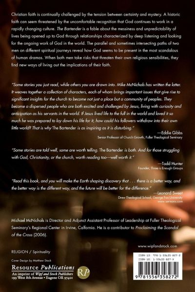 Christian faith is continually challenged by the tension between certainty and mystery. A historic faith can seem threatened by the uncomfortable x that God continues to work in a rapidly changing culture. The Bartender is a fable about the messiness and unpredictability of lives being opened up to God through relationships characterized by deep listening and looking for the ongoing work of God in the world. The parallel and sometimes intersecting paths of two men on different spiritual journeys reveal how God seems to be present in the most scandalous of human dramas. When both men take risks that threaten their own religious sensibilities, they find new ways of living out the implications of their faith.