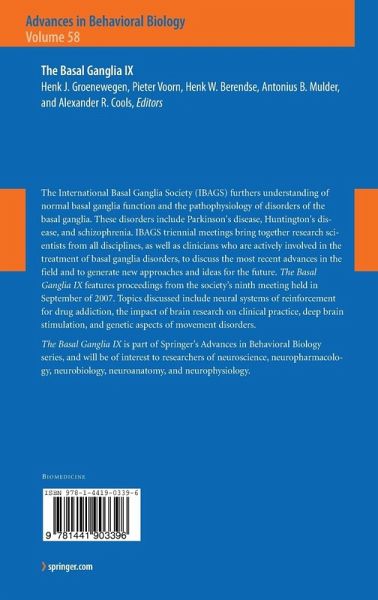 Functional Organization of the Basal Ganglia.- You Cannot Have a Vertebrate Brain Without a Basal Ganglia.- The Involvement of Corticostriatal Loops in Learning Across Tasks, Species, and Methodologies.- Information Processing in the Striatum of Behaving Monkeys.- What Controls the Timing of Striatal Spiny Cell Action Potentials in the Up State?.- Asymmetric Encoding of Positive and Negative Expectations by Low-Frequency Discharge Basal Ganglia Neurons.- Stimulation Effect on Neuronal Activity in the Globus Pallidus of the Behaving Macaque.- High-Frequency Stimulation of the Globus Pallidus External Segment Biases Behavior Toward Reward.- The Subthalamic Region of Luys, Forel, and Dejerine.- Organization of Motor Cortical Inputs to the Subthalamic Nucleus in the Monkey.- A Subpopulation of Mesencephalic Dopamine Neurons Interfaces the Shell of Nucleus Accumbens and the Dorsolateral Striatum in Rats.- Synchrony of the Rat Medial Prefrontal Cortex Network During Isoflurane Anaesthesia.- On the Relationships Between the Pedunculopontine Tegmental Nucleus, Corticostriatal Architecture, and the Medial Reticular Formation.- Microcircuits of the Pedunculopontine Nucleus.- Basal Ganglia Model Studies.- The Effects of Dopaminergic Modulation on Afferent Input Integration in the Ventral Striatal Medium Spiny Neuron.- A Spiking Neuron Model of the Basal Ganglia Circuitry that Can Generate Behavioral Variability.- Learning with an Asymmetric Teacher: Asymmetric Dopamine-Like Response Can Be Used as an Error Signal for Reinforcement Learning.- A Theoretical Information Processing-Based Approach to Basal Ganglia Function.- Pharmacological and Receptor Studies in the Basal Ganglia.- The Cellular Localisation of GABAA and Glycine Receptors in the Human Basal Ganglia.- Comparative Ultrastructural Analysis of D1 and D5 Dopamine Receptor Distribution in the Substantia Nigra and Globus Pallidus of Monkeys.- Motor-Skill Learning in a Novel Running-Wheel Paradigm: Long-Term Memory Consolidated by D1 Receptors in the Striatum.- Discriminative Stimulus- vs. Conditioned Reinforcer-Induced Reinstatement of Drug-Seeking Behavior and arc mRNA Expression in Dorsolateral Striatum.- Preferential Modulation of the GABAergic vs. Dopaminergic Function in the Substantia Nigra by 5-HT2C Receptor.- Blockade of GABA Transporter (GAT-1) Modulates the GABAergic Transmission in the Rat Globus Pallidus.- Nitric Oxide Modulation of the Dopaminergic Nigrostriatal System: Focus on Nicotine Action.- Regulation of Dopamine Release by Striatal Acetylcholine and Nicotine Is via Distinct Nicotinic Acetylcholine Receptors in Dorsal vs. Ventral Striatum.- Nitrergic Tone Influences Activity of Both Ventral Striatum Projection Neurons and Interneurons.- Basal Ganglia Disorders: Animal Studies.- Kainic Acid-Induced Cell Proliferation in the Striatum Is Not Estrogen Dependent.- Striatal Dopaminergic Denervation and Spine Loss in MPTP-Treated Monkeys.- Prevention of Calbindin Recruitment into Nigral Dopamine Neurons from MPTP-Induced Degeneration in Macaca fascicularis.- Changes in the Subcellular Localization and Functions of GABA-B Receptors in the Globus Pallidus of MPTP-Treated Monkeys.- Morphogenesis of Rodent Neostriatum Following Early Developmental Dopamine Depletion.- Upregulation of NAD(P)H:Quinone Oxidoreductase (NQO1) in Glial Cells of 6-Hydroxydopamine-Lesioned Substantia Nigra in the Rat.- Clioquinol Protects Against Cell Death in Parkinson's Disease Models In Vivo and In Vitro.- Oscillatory Activity and Synchronization in the Basal Ganglia Network in Rodent Models ofParkinson's Disease.- Behavioural Correlates of Dopaminergic Agonists' Dyskinetic Potential in the 6-OHDA-Lesioned Rat.- Basal Ganglia and Behaviour: Behavioural Effects of Deep Brain Stimulation in Experimental Neurological and Psychiatric Disorders.- Modeling Nonmotor Symptoms of Parkinson's Disease in Genetic Mouse Models.- Differential Expression of Doublecortin-Like Kinase Gene Products in the Striatum of Behaviorally Hyperresponsive Rats.- Basal Ganglia Disorders: Human Studies.- Paradox of the Basal Ganglia Model: The Antidyskinetic Effect of Surgical Lesions in Movement Disorders.- The Dynamic Relationship Between Voluntary and Involuntary Motor Behaviours in Patients with Basal Ganglia Disorders.- Reduced and Modified Neuronal Activity in the Subthalamic Nucleus of Parkinson's Disease Patients with Prior Pallidotomy.- Inhibition of Neuronal Firing in the Human Substantia Nigra Pars Reticulata in Response to High-Frequency Microstimulation Aids Localization of the Subthalamic Nucleus.- Activity of Thalamic Ventralis Oralis Neurons in Rigid-Type Parkinson's Disease.- Motor and Non-motor Effects of PPN-DBS in PD Patients: Insights from Intra-operative Electrophysiology.- Observation of Involuntary Movements Through Clinical Effects of Surgical Treatments.
