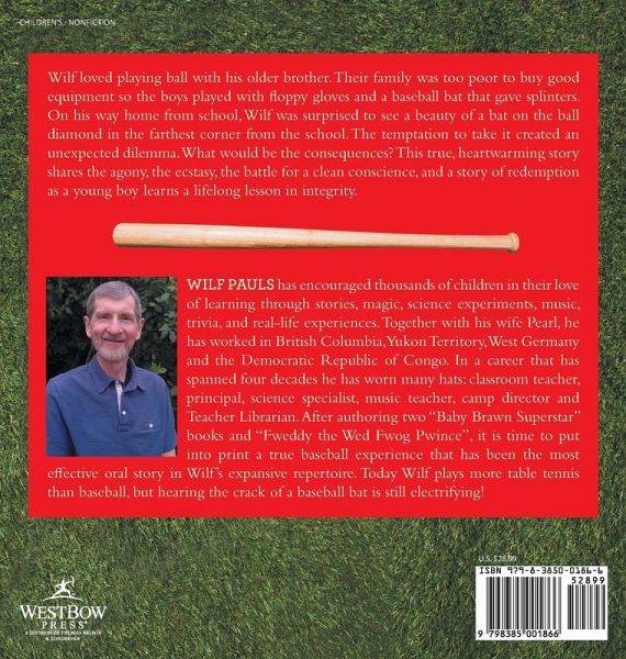Wilf loved playing ball with his older brother. Their family was too poor to buy good equipment so the boys played with floppy gloves and a baseball bat that gave splinters. On his way home from school, Wilf was surprised to see a beauty of a bat on the ball diamond in the farthest corner from the school. The temptation to take it created an unexpected dilemma. What would be the consequences? This true, heartwarming story shares the agony, the ecstasy, the battle for a clean conscience, and a story of redemption as a young boy learns a lifelong lesson in integrity.