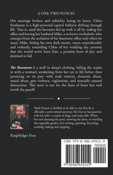 Her marriage broken and infidelity losing its luster, Chloe Stenhouse is a high-powered capitol lobbyist drifting through life. That is, until she becomes fed up with it all by ending her affair and leaving her husband Mike, a reclusive workaholic who emerges from the seclusion of his basement office only when he must. Mike, hiding his own dark secrets, reacts unpredictably and violently, reminding Chloe of her wedding day promise that she would never leave him, a promise born of pity and destined to fail. The Basement is a wolf in sheep's clothing, lulling the reader in with a woman's awakening from her rut in life before then pouncing on its prey with male toxicity, domestic abuse, sexual abuse, gun violence, vigilantism, and mutually assured destruction. This story is not for the faint of heart but well worth the payoff.