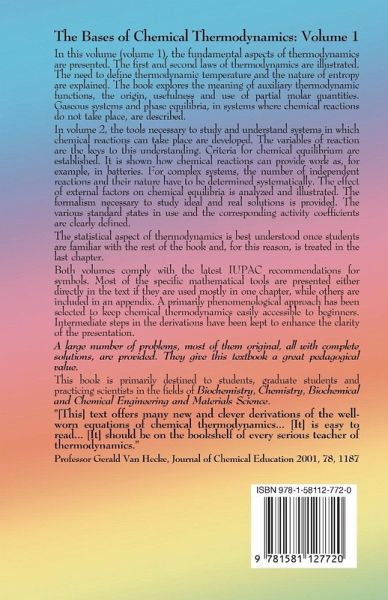 This is volume 1 of a two-volume set. A primarily phenomenological approach was selected to keep chemical thermodynamics accessible to beginners. Coverage encompasses the fundamental aspects of thermodynamics, for students in chemistry, chemical engineering, and material sciences. Most of the specific mathematical tools are presented directly in the text; problems and solutions are provided.
