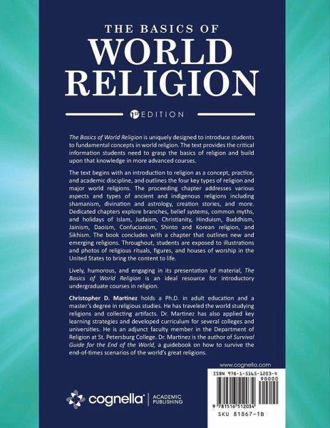 The Basics of World Religion is uniquely designed to introduce students to fundamental concepts in world religion. The text provides the critical information students need to grasp the basics of religion and build upon that knowledge in more advanced courses. The text begins with an introduction to religion as a concept, practice, and academic discipline, and outlines the four key types of religion and major world religions. The proceeding chapter addresses various aspects and types of ancient and indigenous religions including shamanism, divination and astrology, creation stories, and more. Dedicated chapters explore branches, belief systems, common myths, and holidays of Islam, Judaism, Christianity, Hinduism, Buddhism, Jainism, Daoism, Confucianism, Shinto and Korean religion, and Sikhism. The book concludes with a chapter that outlines new and emerging religions. Throughout, students are exposed to illustrations and photos of religious rituals, figures, and houses of worship in the United States to bring the content to life. Lively, humorous, and engaging in its presentation of material, The Basics of World Religion is an ideal resource for introductory undergraduate courses in religion. Christopher D. Martinez holds a Ph.D. in adult education and a master’s degree in religious studies. He has traveled the world studying religions and collecting artifacts. Dr. Martinez has also applied key learning strategies and developed curriculum for several colleges and universities. He is an adjunct faculty member in the Department of Religion at St. Petersburg College. Dr. Martinez is the author of Survival Guide for the End of the World, a guidebook on how to survive the end-of-times scenarios of the world’s great religions.