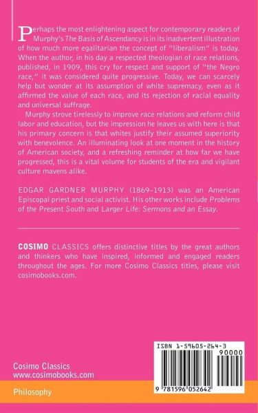 There is, it seems to me, a racial cosmopolitanism which is quite as morbid as the provincialism of the mob, and quite as dangerous (were it ever given its full institutional expression) to the peace of states and the deeper interest of civilization. -Edgar Gardner Murphy, in the Preface Perhaps the most enlightening aspect for contemporary readers of Murphy's The Basis of Ascendancy is in its inadvertent illustration of how much more egalitarian the concept of "liberalism" is today. When the author, in his day a respected theologian of race relations, published, in 1909, this cry for respect and support of "the Negro race," it was considered quite progressive. Today, we can scarcely help but wonder at its assumption of white supremacy, even as it affirmed the value of each race, and its rejection of racial equality and universal suffrage. Murphy strove tirelessly to improve race relations and reform child labor and education, but the impression he leaves us with here is that his primary concern is that whites justify their assumed superiority with benevolence. An illuminating look at one moment in the history of American society, and a refreshing reminder at how far we have progressed, this is a vital volume for students of the era and vigilant culture mavens alike. EDGAR GARDNER MURPHY (1869-1913) was an American Episcopal priest and social activist. His other works include Problems of the Present South and Larger Life: Sermons and an Essay.