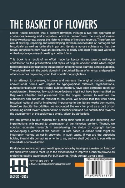 The Basket Of Flowers This book is a result of an effort made by us towards making a contribution to the preservation and repair of original classic literature. In an attempt to preserve, improve and recreate the original content, we have worked towards: 1. Type-setting & Reformatting: The complete work has been re-designed via professional layout, formatting and type-setting tools to re-create the same edition with rich typography, graphics, high quality images, and table elements, giving our readers the feel of holding a 'fresh and newly' reprinted and/or revised edition, as opposed to other scanned & printed (Optical Character Recognition - OCR) reproductions. 2. Correction of imperfections: As the work was re-created from the scratch, therefore, it was vetted to rectify certain conventional norms with regard to typographical mistakes, hyphenations, punctuations, blurred images, missing content/pages, and/or other related subject matters, upon our consideration. Every attempt was made to rectify the imperfections related to omitted constructs in the original edition via other references. However, a few of such imperfections which could not be rectified due to intentional\unintentional omission of content in the original edition, were inherited and preserved from the original work to maintain the authenticity and construct, relevant to the work. We believe that this work holds historical, cultural and/or intellectual importance in the literary works community, therefore despite the oddities, we accounted the work for print as a part of our continuing effort towards preservation of literary work and our contribution towards the development of the society as a whole, driven by our beliefs. We are grateful to our readers for putting their faith in us and accepting our imperfections with regard to preservation of the historical content. HAPPY READING!