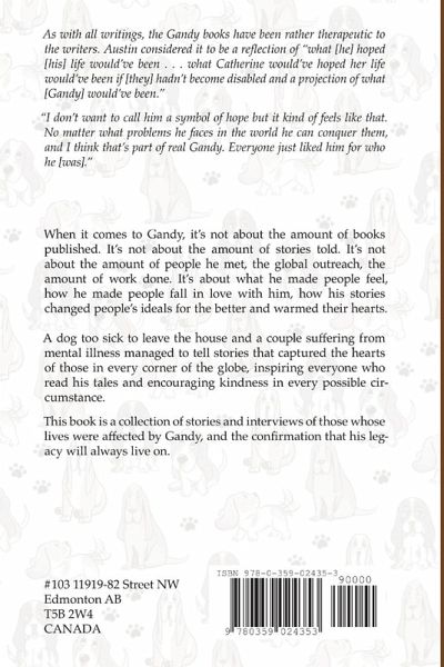 When it comes to Gandy, it's not about the amount of books published. It's not about the amount of stories told. It's not about the amount of people he met, the global outreach, the amount of work done. It's about what he made people feel, how he made people fall in love with him, how his stories changed people's ideals for the better and warmed their hearts. A dog too sick to leave the house and a couple suffering from mental illness managed to tell stories that captured the hearts of those in every corner of the globe, inspiring everyone who read his tales and encouraging kindness in every possible circumstance. This book is a collection of stories and interviews of those whose lives were affected by Gandy, and the confirmation that his legacy will always live on.