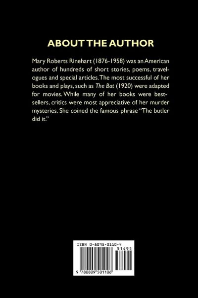 Mary Roberts Rinehart (1876-1958) was an American author of hundreds of short stories, poems, travelogues and special articles. Some of her very successful books and plays, such as "The Bat" (1920) were adapted for movies. While many of her books were best-sellers, critics were most appreciative of her murder mysteries. She also coined the famous phrase "The butler did it."