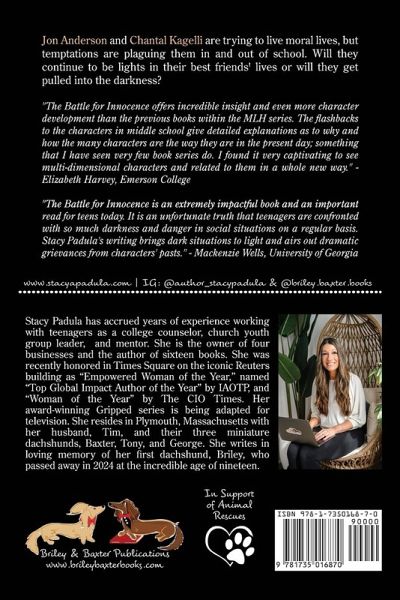 Author and entrepreneur, Stacy A. Padula from Plymouth, Massachusetts has accrued years of experience working with adolescents as a college counselor, mentor, life coach, and youth group leader. In 2019 and 2020 respectively, the International Association of Top Professionals (New York, NY) named her "Top Educational Consultant of the Year" and "Empowered Woman of the Year." She is the CEO and founder of both South Shore College Consulting & Tutoring and Briley & Baxter Publications-a publishing company that donates a portion of its proceeds to animal rescues each month. She is the author of the Gripped and the Montgomery Lake High young-adult book series. Her first novel, The Right Person, was published in 2010, followed by When Darkness Tries to Hide, The Aftermath, The Battle for Innocence, and The Forces Within. Throughout 2019 and 2020, she released a new series titled Gripped, which takes place in the same world as Montgomery Lake High but focuses on different main characters. Multiple Gripped books became #1 New Releases in their genre on Amazon. In 2019, she also wrote her first screenplay, an adaptation of her novel The Aftermath and worked on a pilot script for Gripped. Her Gripped book series is now being adapted for TV by Emmy-winning producer Mark Blutman. Learn more at www.stacyapadula.com.