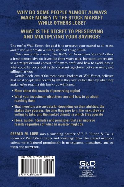 WHY DO SOME PEOPLE ALMOST ALWAYS MAKE MONEY IN THE STOCK MARKET WHILE OTHERS LOSE? WHAT IS THE SECRET TO PRESERVING AND MULTIPLYING YOUR SAVINGS? The turf is Wall Street, the goal is to preserve your capital at all costs, and to win is to "make a killing without being killed." This memorable classic, The Battle for Investment Survival, offers a fresh perspective on investing from years past. Investors are treated to a straightforward account of how to profit and how to avoid loss in what could be described as the constant tug-of-war between rising and falling markets. Gerald Loeb, one of the most astute brokers on Wall Street, believed that most people will benefit by what they save rather than by what they make. After reading this book you will know: 1. . More about the hazards of preserving capital 2. . What your investment objectives are and how to go about reaching them 3. . That investors are successful depending on their abilities, the stakes they possess, the time they give to it, the risks they are willing to take, and the market climate in which they operate 4. . Ideas, guides, formulas and principles that can than improve results regardless of what an investor might do 5. GERALD M. LOEB was a founding partner of E.F. Hutton & Co., a renowned Wall Street trader and brokerage firm. His market interpretations were featured prominently in newspapers, magazines, radio and television.